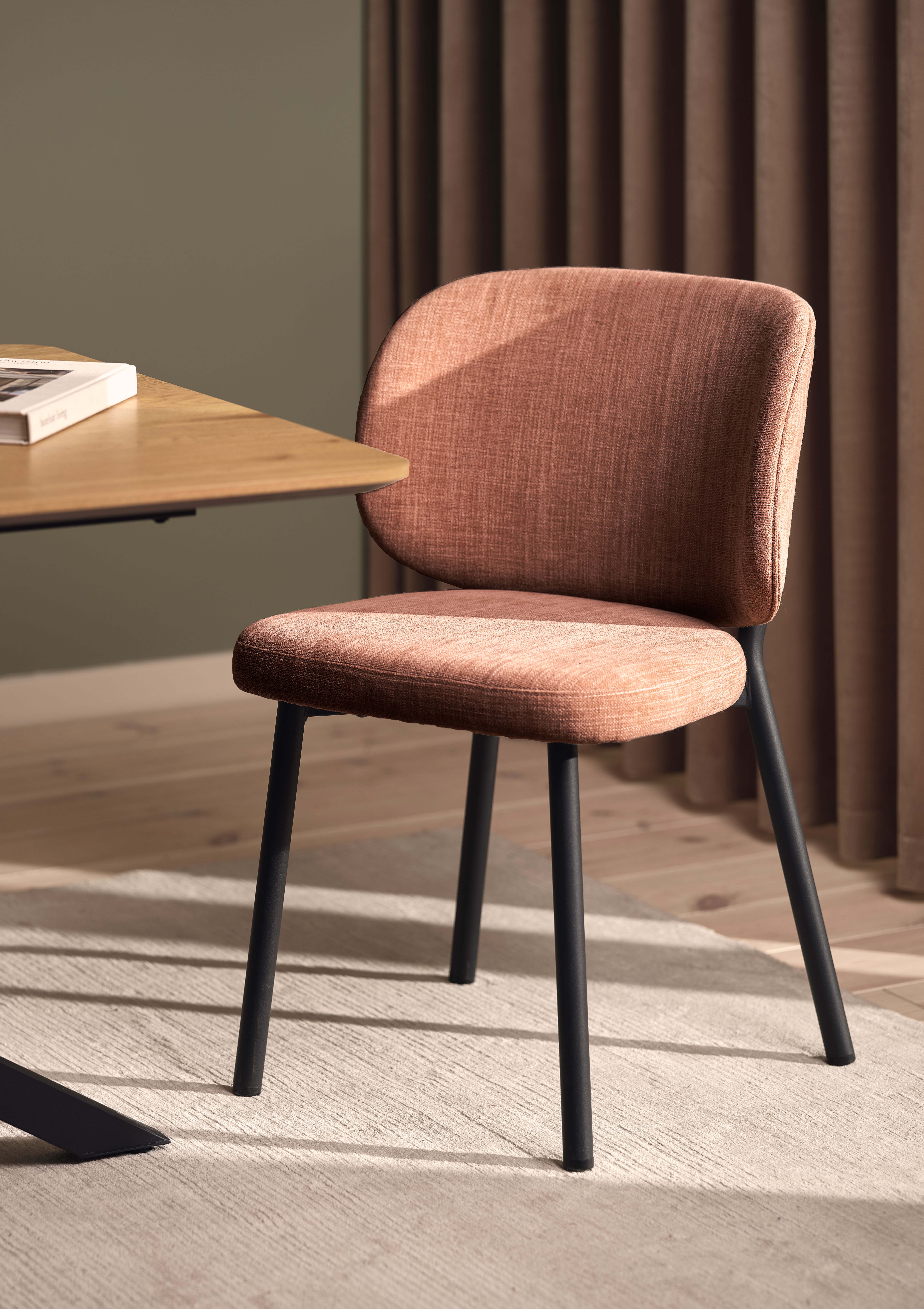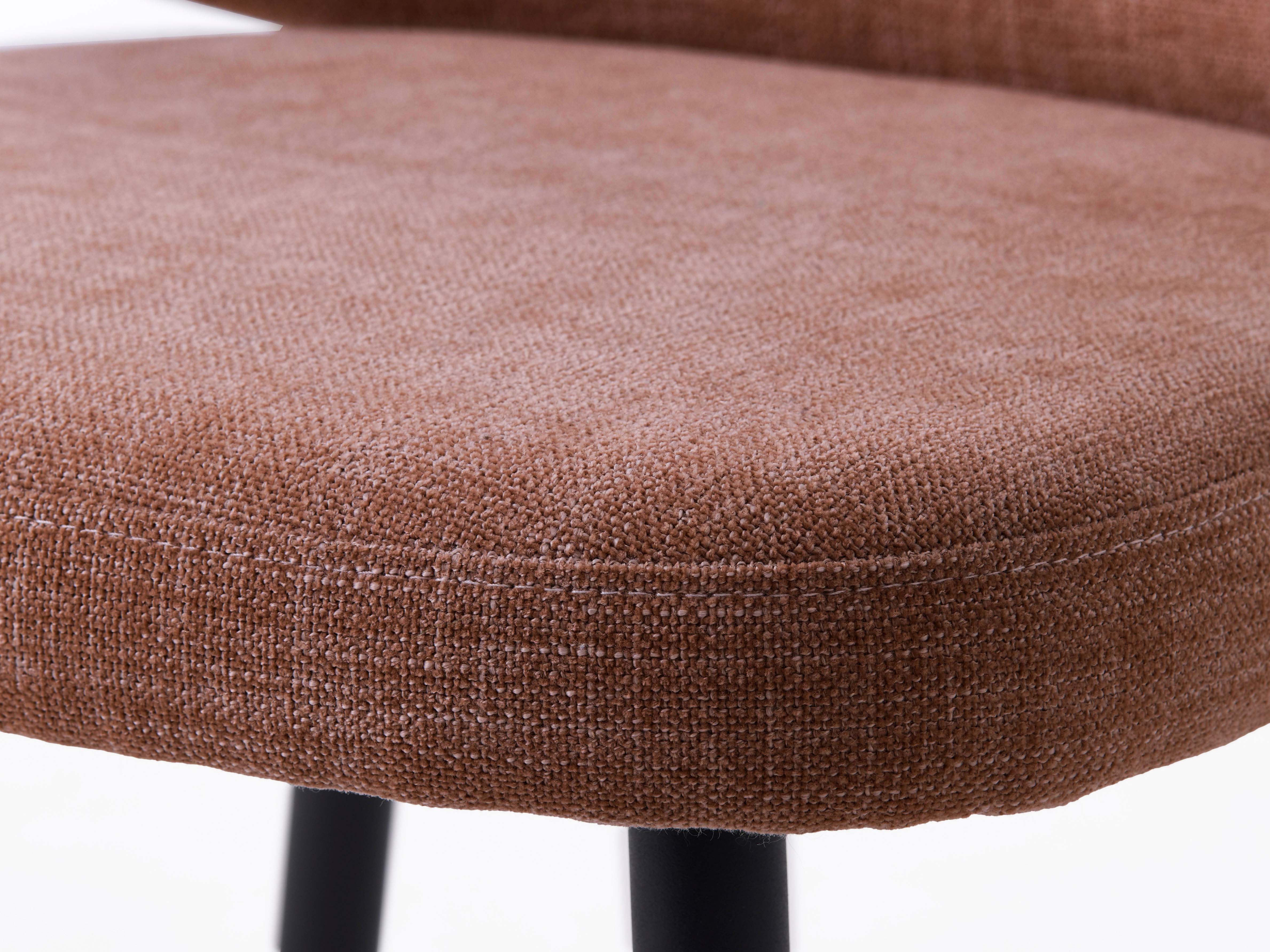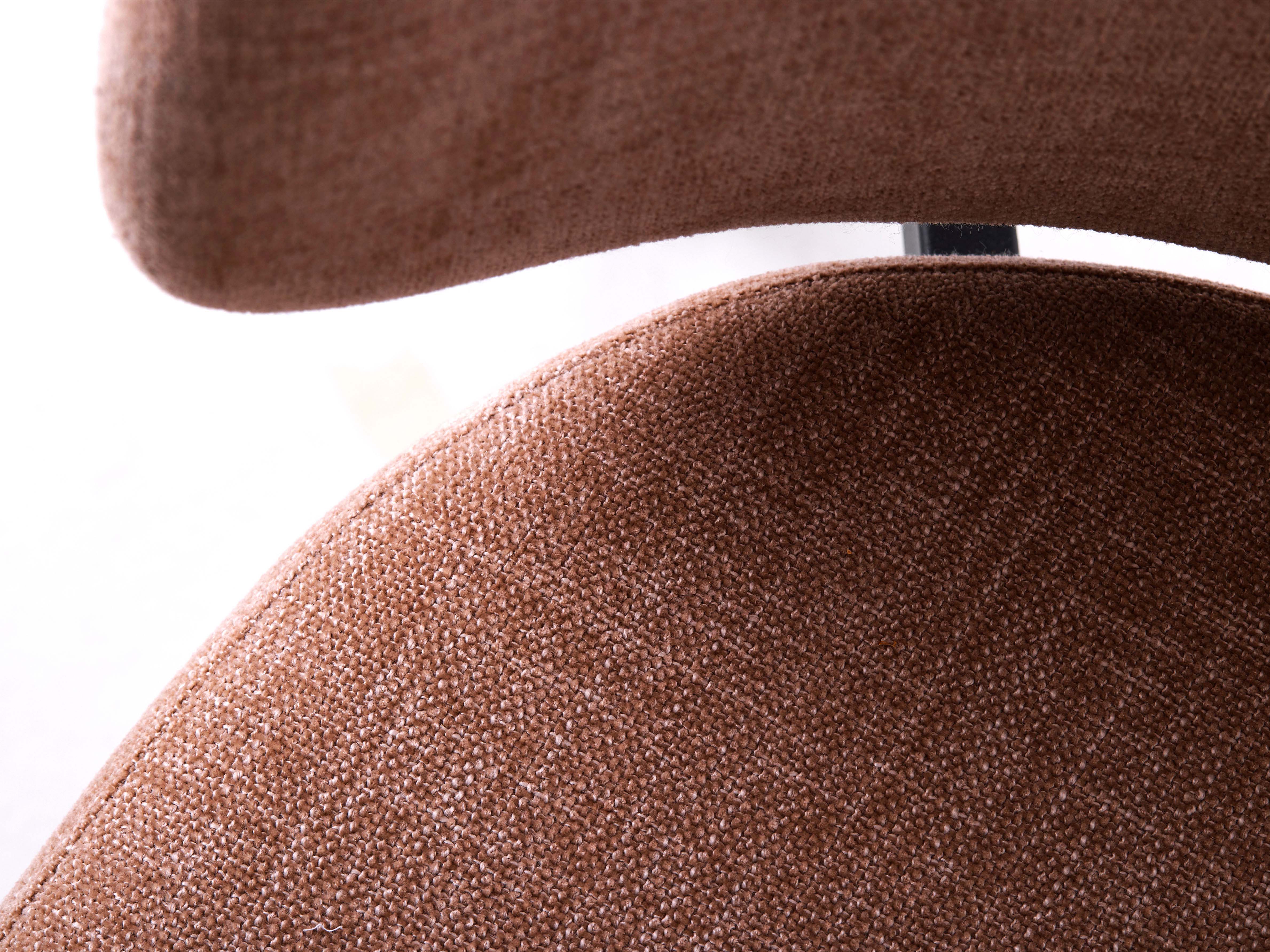 SWAN kėdės išvaizda: juodu milteliniu būdu dengtas metalinis rėmas suderintas su šilta boucle stiliaus medžiaga.